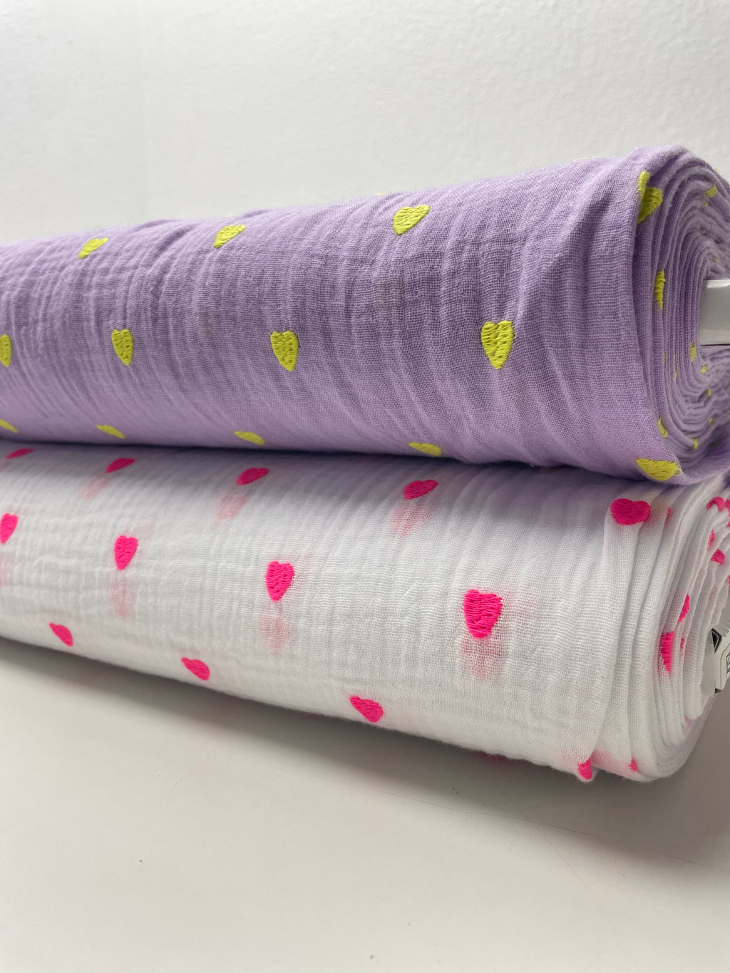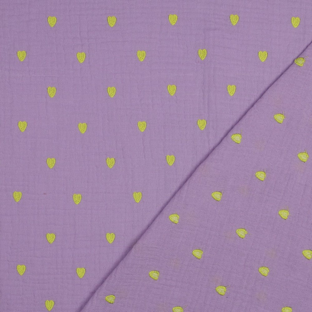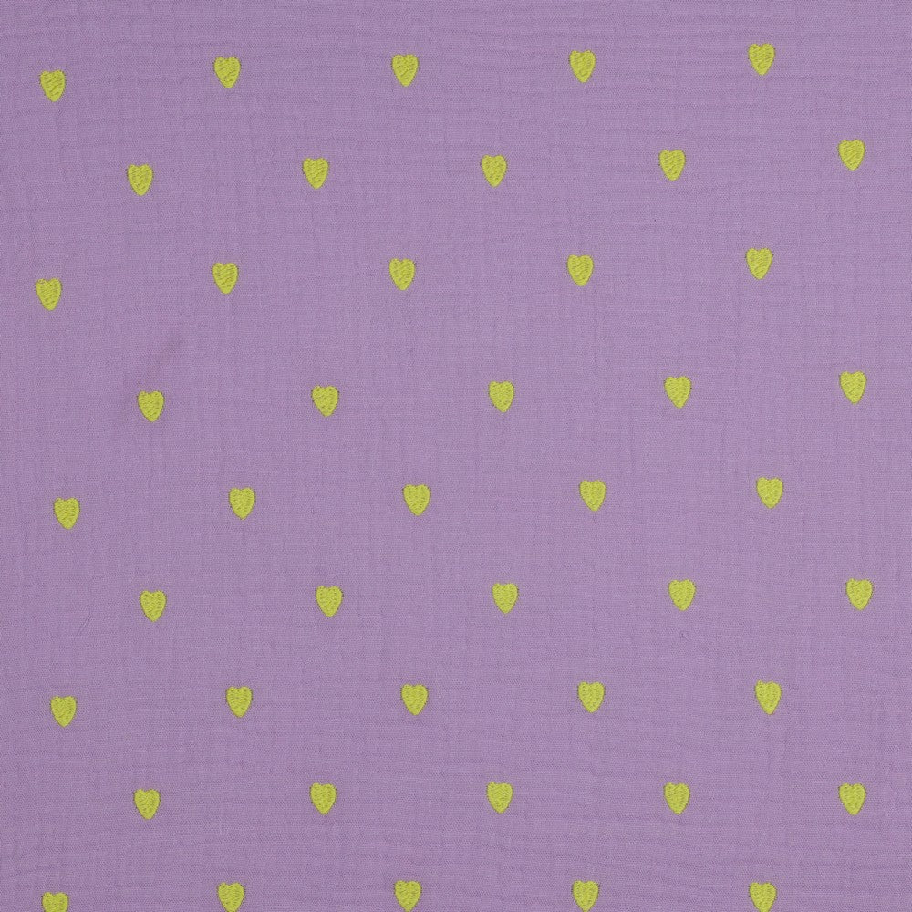 Musselin Stoff Double Gauze Stickerei Herzen flieder neongelb